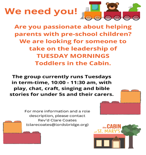 Revd Claire Robertson, Lead Minister for Coton, Barton, Harlton and Haslingfield: 01223 874194; clairerobertson@lordsbridge.org
